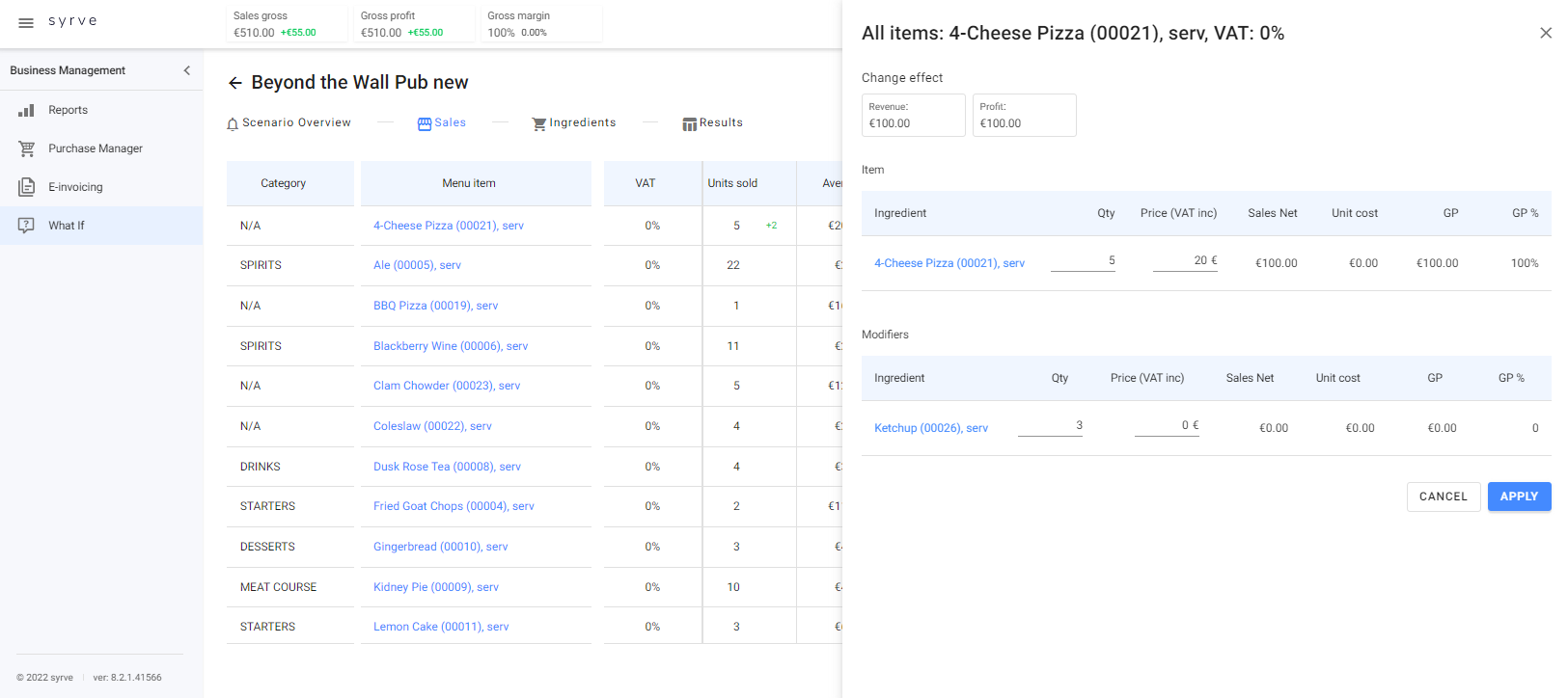 Kliknij na produkt, aby zobaczyć więcej szczegółów i móc zmienić ilość sprzedaną oraz cenę produktu. Po wprowadzeniu zmian kliknij ZASTOSUJ, aby zobaczyć wpływ tych zmian na wyniki Twojego lokalu. Możesz także otworzyć rekord produktu i zmienić ilość użytych składników.