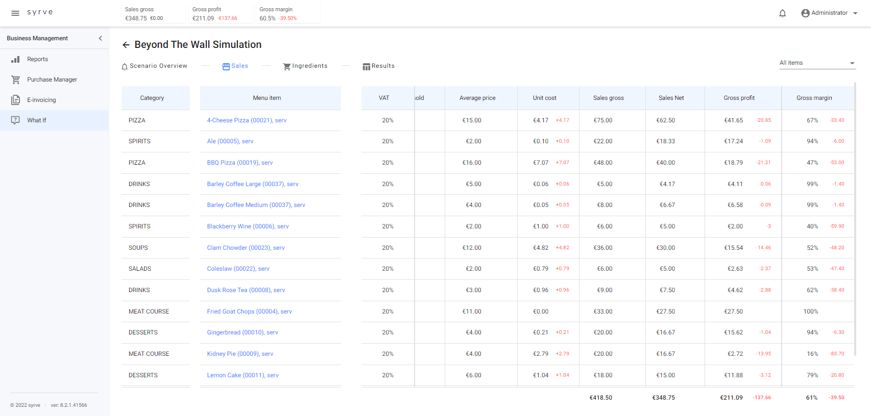 Po przygotowaniu symulacji zostaniesz przeniesiony do zakładki Sprzedaż, gdzie zobaczysz sprzedane w Twoim lokalu produkty, ich kategorię, cenę sprzedaży, koszt jednostkowy, marżę kontrybucyjną oraz inne przydatne informacje. W tabeli możesz zobaczyć, czy Twoje koszty i ceny sprzedaży zmieniały się w wybranym okresie i w jaki sposób. Wartości wynikowe są podane czarnym kolorem, zmiany — na czerwono lub zielono.