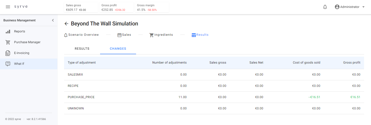 Aby zobaczyć wyniki zmian pogrupowane według stawek VAT, przejdź do zakładki Wyniki. Przejdź do podzakładki Zmiany, aby zobaczyć ogólny wpływ zmian pod względem kosztów i zysków, pogrupowany według typu zmiany.