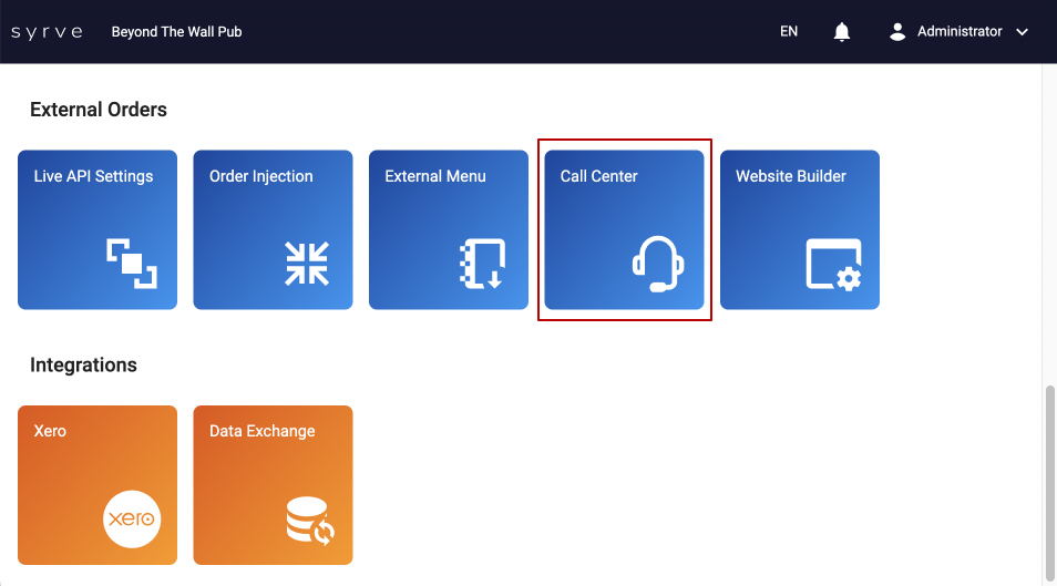 Aby uzyskać dostęp do internetowego call center, kliknij aplikację Call Center w sekcji Zamówienia zewnętrzne w swoim koncie osobistym w biurze internetowym Syrve.