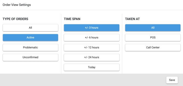 Domyślnie, po otwarciu internetowego call center, widoczne są aktywne zamówienia ze wszystkich sklepów w sieci. Kliknij filtr Aktywne, +/- 3 godziny umieszczony na górze ekranu, aby otworzyć menu rozwijane, gdzie możesz wybrać zamówienia według następujących kryteriów: