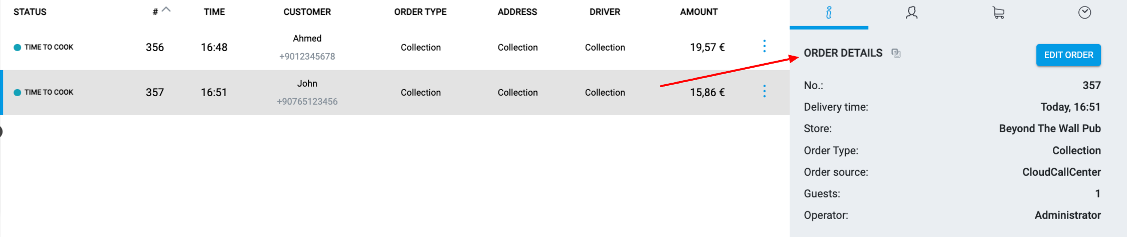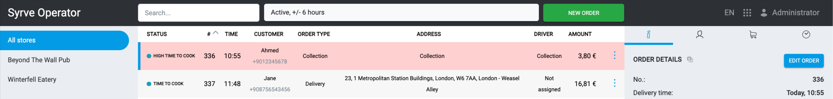 Szczegóły zamówienia. Tutaj możesz zobaczyć numer zamówienia, czas dostawy, sklep, w którym zamówienie zostało złożone, typ zamówienia, źródło zamówienia, imię kierowcy (dla zamówień na dostawę) oraz nazwę operatora, który przyjął zamówienie.