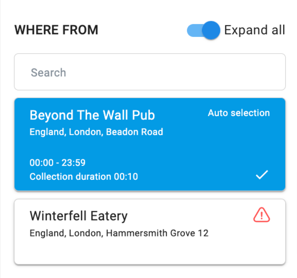 Jeśli operator wybierze lokalizację, która nie dostarcza do niektórych obszarów, w prawym dolnym rogu bloku szczegółów zamówienia pojawi się ostrzeżenie (wykrzyknik ).