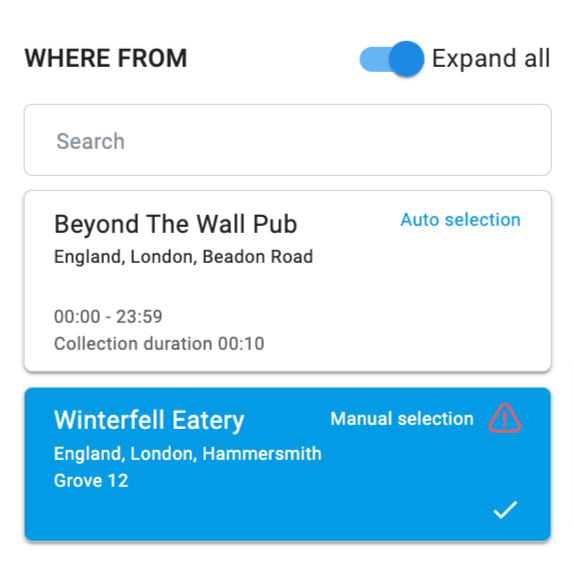 Jeśli sklep został wybrany ręcznie, jest oznaczony jako "Wybór ręczny". Jeśli warunki dostawy (np. czas lub adres) ulegną zmianie, pozostaje wybrany, nawet jeśli nie spełnia już godzin pracy i ustawień mapowania lub staje się niedostępny (np. POS został wyłączony). W takim przypadku sklep będzie oznaczony znakiem .