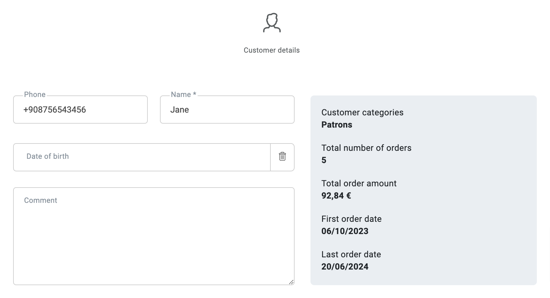 Jeśli korzystasz z Syrve Loyalty w swoim sklepie, dane klienta będą automatycznie synchronizowane z bazą danych systemu, gdzie możesz edytować rekord klienta — dodawać dodatkowe informacje oraz określić zgodę na przetwarzanie danych osobowych.