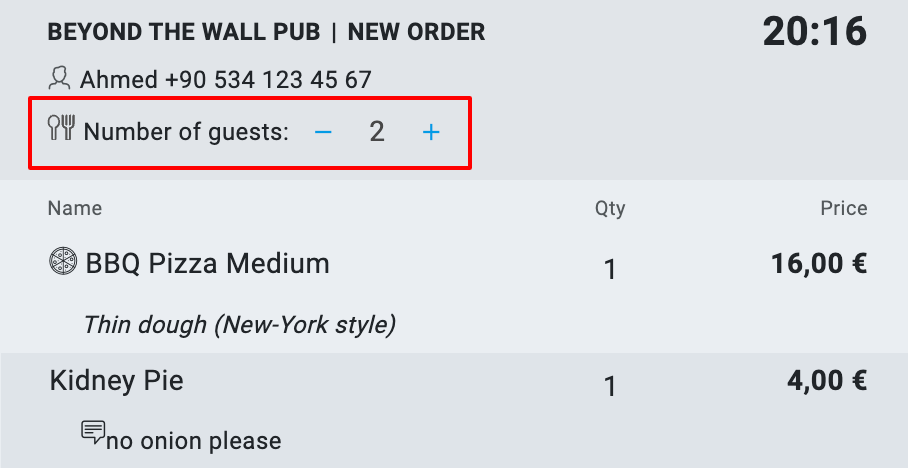 Aby poinformować personel, ile kompletów sztućców powinien dodać do zamówienia, określ liczbę klientów — domyślnie jest to jeden klient. Użyj przycisków -/+ do zmiany liczby klientów.