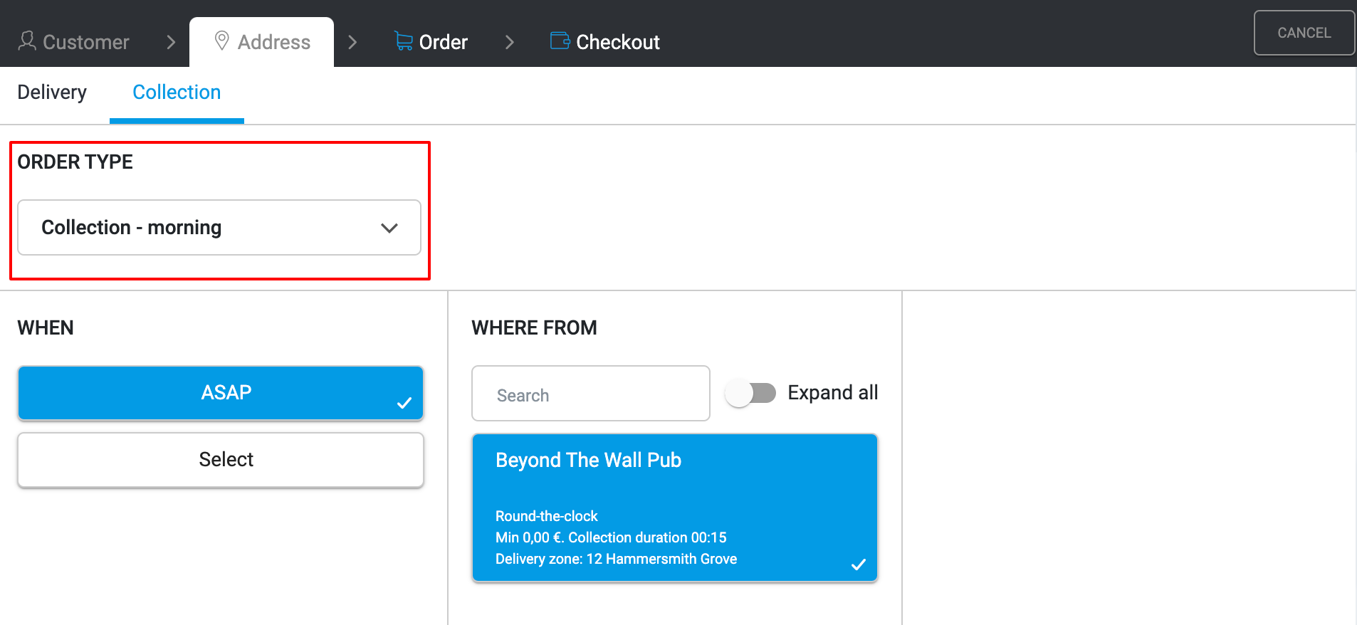 Jeśli wybierzesz tryb Odbiór, wybierz Typ zamówienia (jeśli dostępny) i wypełnij kolumny Kiedy oraz Skąd.