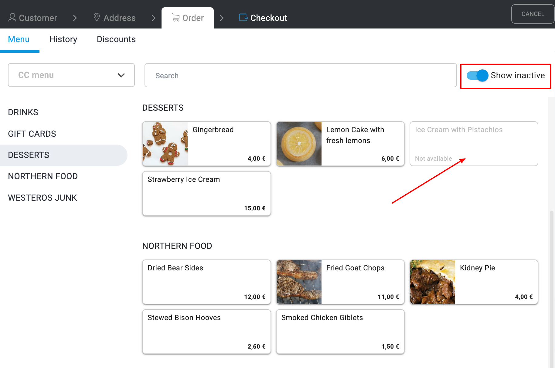 Jeśli produkt znajduje się na liście braków magazynowych lub nie jest dostępny w wybranym sklepie, będzie wyświetlany jako nieaktywny w menu. Użyj przełącznika Pokaż nieaktywne, aby pokazać lub ukryć niedostępne produkty.
