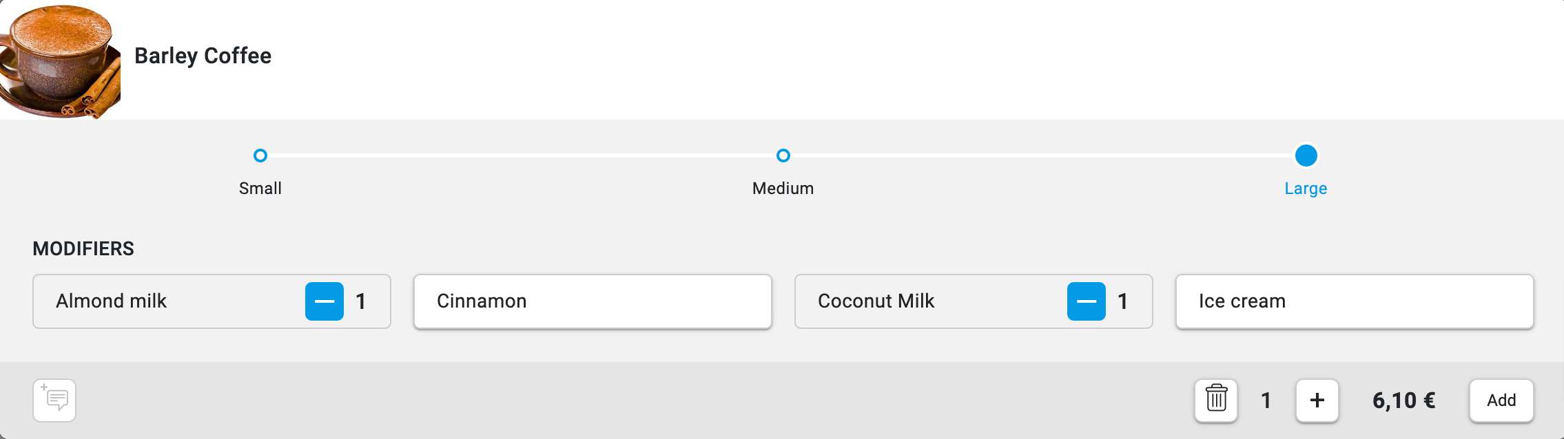 Dla niektórych pozycji należy wybrać rozmiary i modyfikatory (więcej szczegółów znajdziesz w artykule Modyfikatory i rozmiary pozycji).