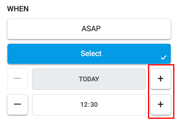 W kolumnie Kiedy wybierz ASAP, jeśli potrzebujesz dostawy tak szybko, jak to możliwe. Jeśli potrzebujesz dostawy na konkretną godzinę, naciśnij Wybierz i ustaw datę oraz godzinę za pomocą przycisków plus (+) i minus (−). Zwróć uwagę, że krok czasowy to 30 minut. Na przykład, jeśli ustawisz czas dostawy na dzisiaj na 23:35, a następnie naciśniesz przycisk plus (+), dostawa zostanie przesunięta o pół godziny i zaplanowana na następny dzień.