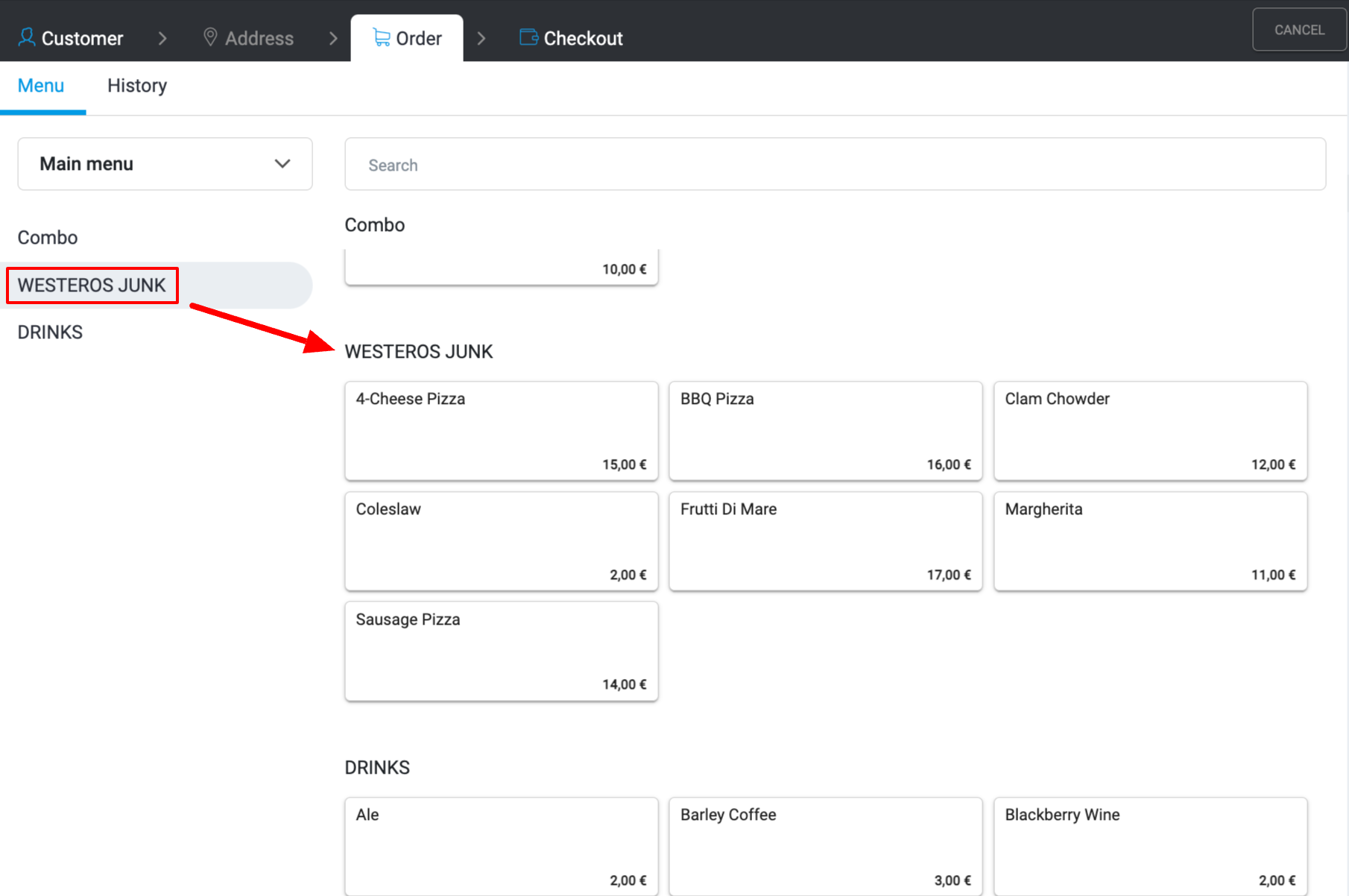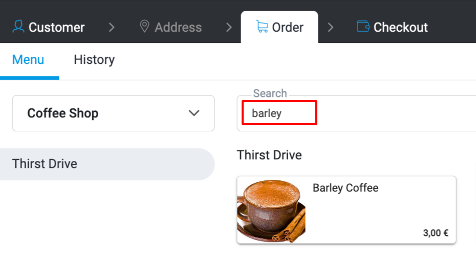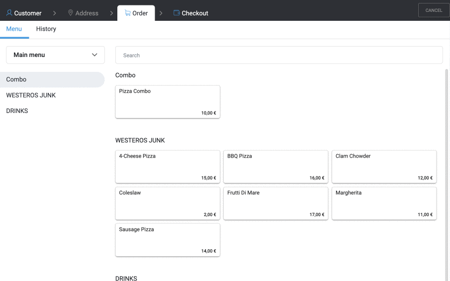 Wybierz pozycje, które klient chce zamówić. Użyj paska wyszukiwania, aby szybko znaleźć pozycję z menu.