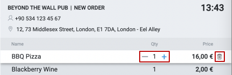 Ilość pozycji można dostosować po prawej stronie za pomocą przycisków - / +, które pojawiają się po najechaniu kursorem na pozycję zamówienia. Możesz także zmienić ilość zamówionej pozycji za pomocą klawiatury: ustaw kursor w polu Ilość i wpisz wymaganą liczbę. Aby usunąć pozycję z zamówienia, kliknij ikonę kosza naprzeciwko tej pozycji.