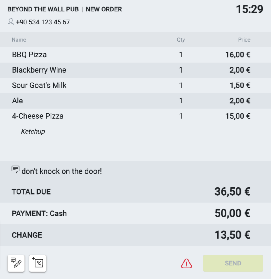 Sprawdź zamówienie i kliknij Wyślij, aby przesłać je do sklepu. Zamówienie może zostać zaakceptowane w aplikacji POS sklepu. Więcej informacji o akceptacji zamówienia na POS znajdziesz w artykule Ekrany pracy dostawy.