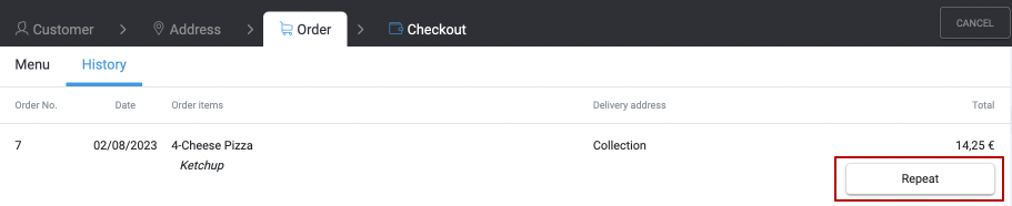 Jeśli Twój klient chce powtórzyć jedno z poprzednich zamówień lub niektóre wcześniej zamówione produkty, możesz to zrobić za pomocą zakładki Historia.