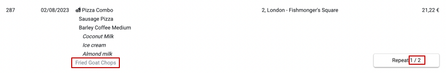 Jeśli niektóre produkty nie są dostępne, takie produkty są wyszarzone, a zamówienie można powtórzyć częściowo. Przycisk Powtórz wskazuje, ile produktów spośród wszystkich jest obecnie dostępnych do zamówienia.