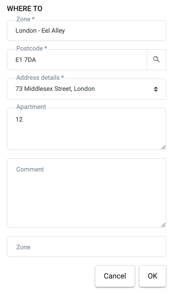 W kolumnie Dokąd wybierz adres klienta z listy lub wpisz nowy. Aby edytować zapisany adres dostawy w historii zamówień, kliknij przycisk . W razie potrzeby zostaw komentarz dla kierowcy.