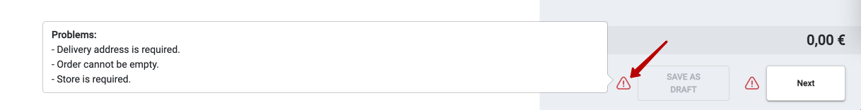Aby zapisać zamówienie jako szkic, kliknij Zapisz jako szkic. Jeśli ten przycisk jest nieaktywny, najedź na ikonę wykrzyknika , aby zobaczyć listę problemów.