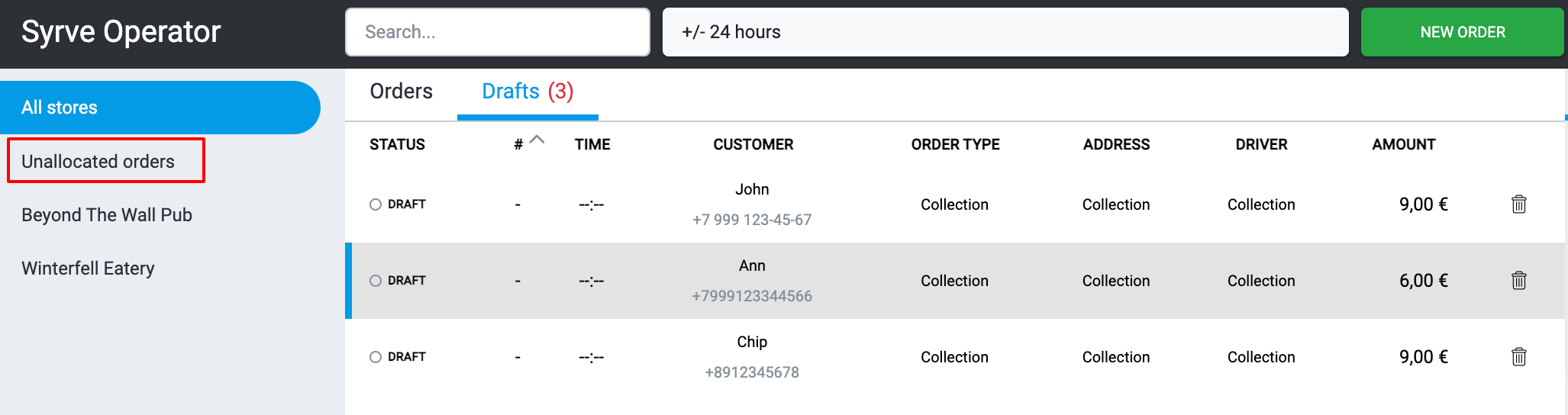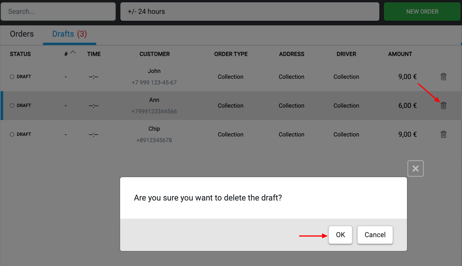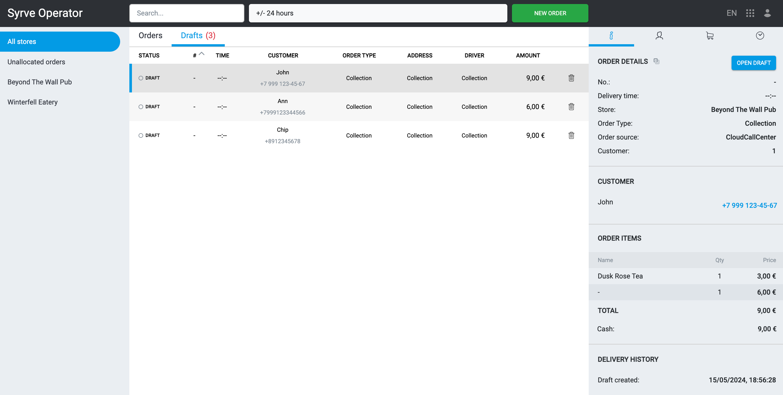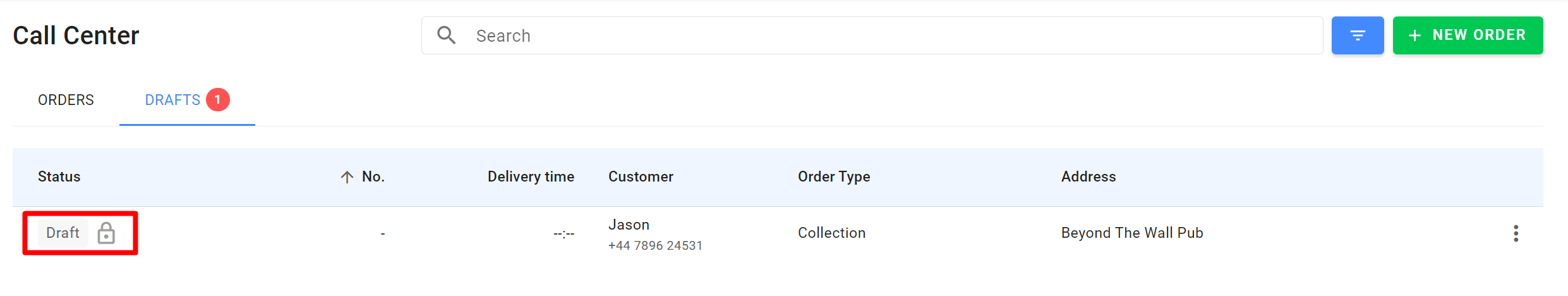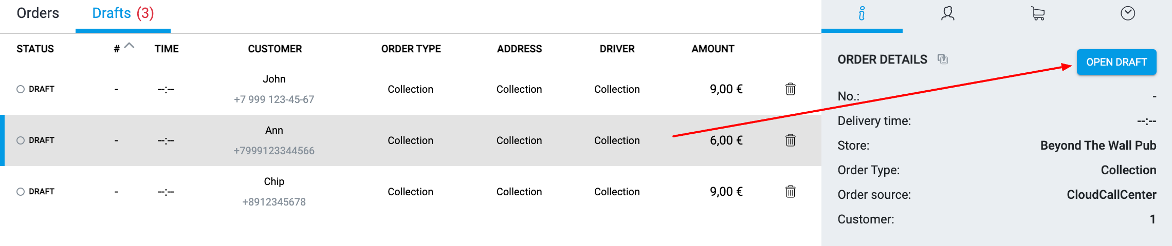 Szkice to zamówienia widoczne w call center, ale niewidoczne na POS. Podczas tworzenia zamówienia operator może zapisać je jako szkic — w takim przypadku zamówienie nie zostanie wysłane do sklepu, lecz będzie czekać na dalsze działania operatora.
