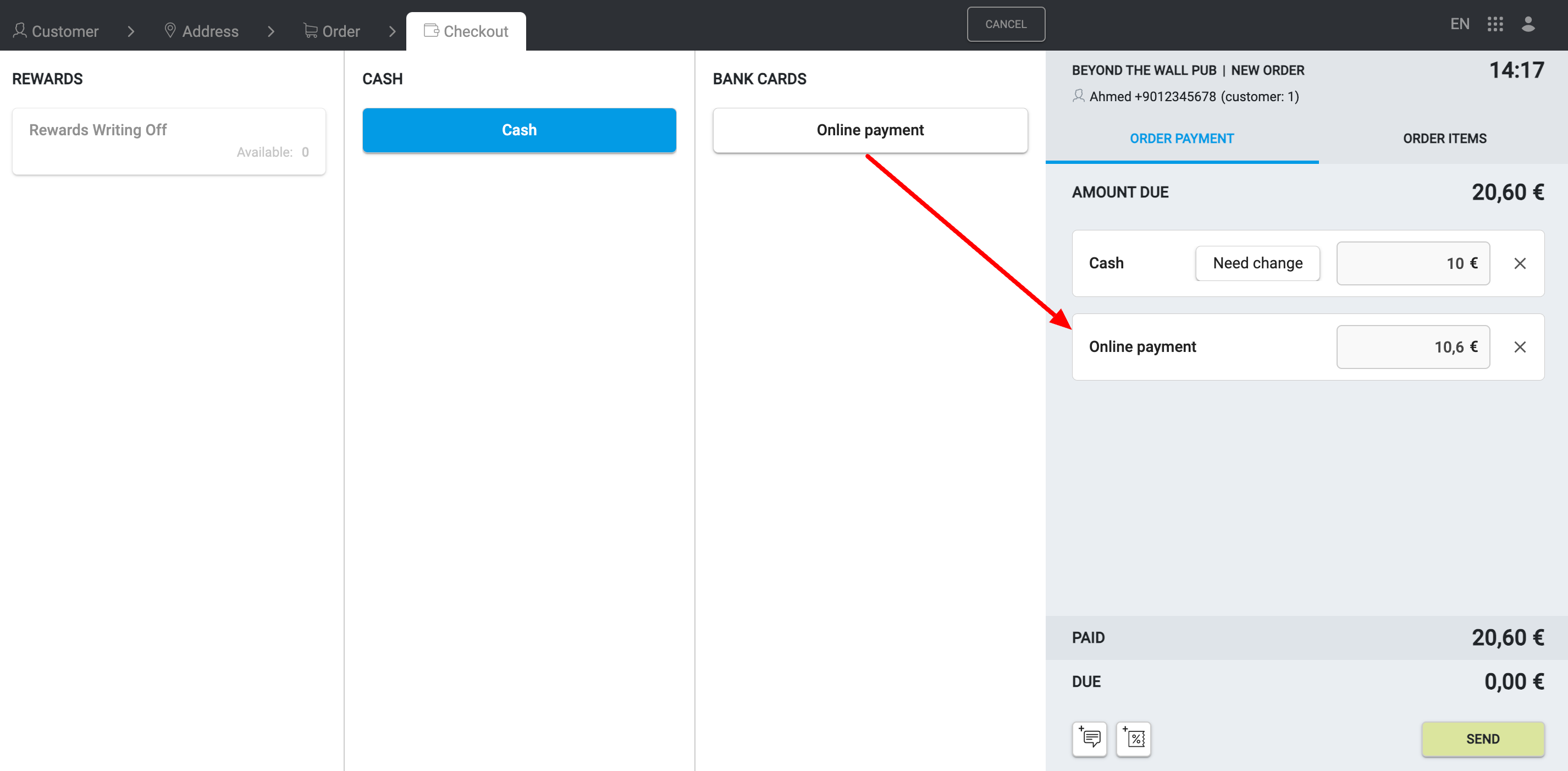 Jeśli klient chce użyć różnych metod płatności w jednym zamówieniu, na przykład gotówkę i karty bankowe, kliknij przyciski Gotówka oraz Płatność online. Oba typy płatności pojawią się po prawej stronie. Wpisz kwotę wpłacaną gotówką, a kwota pobierana z karty bankowej zostanie obliczona automatycznie.