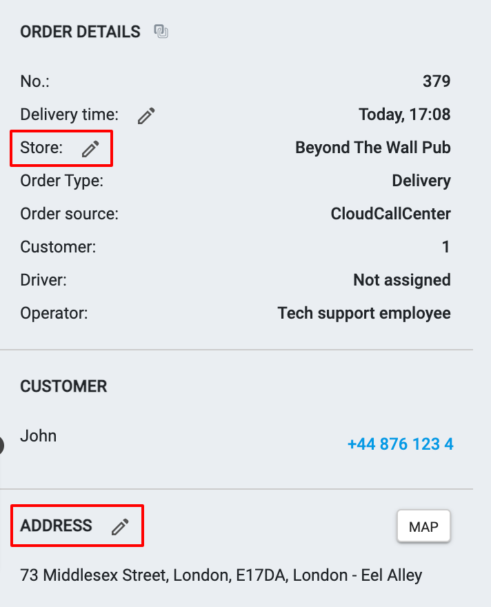 Kliknij przycisk obok pola Sklep, aby zmienić restaurację, która przygotuje zamówienie. Zapisz zmiany. W przypadku dostawy możesz również zmienić Adres.
