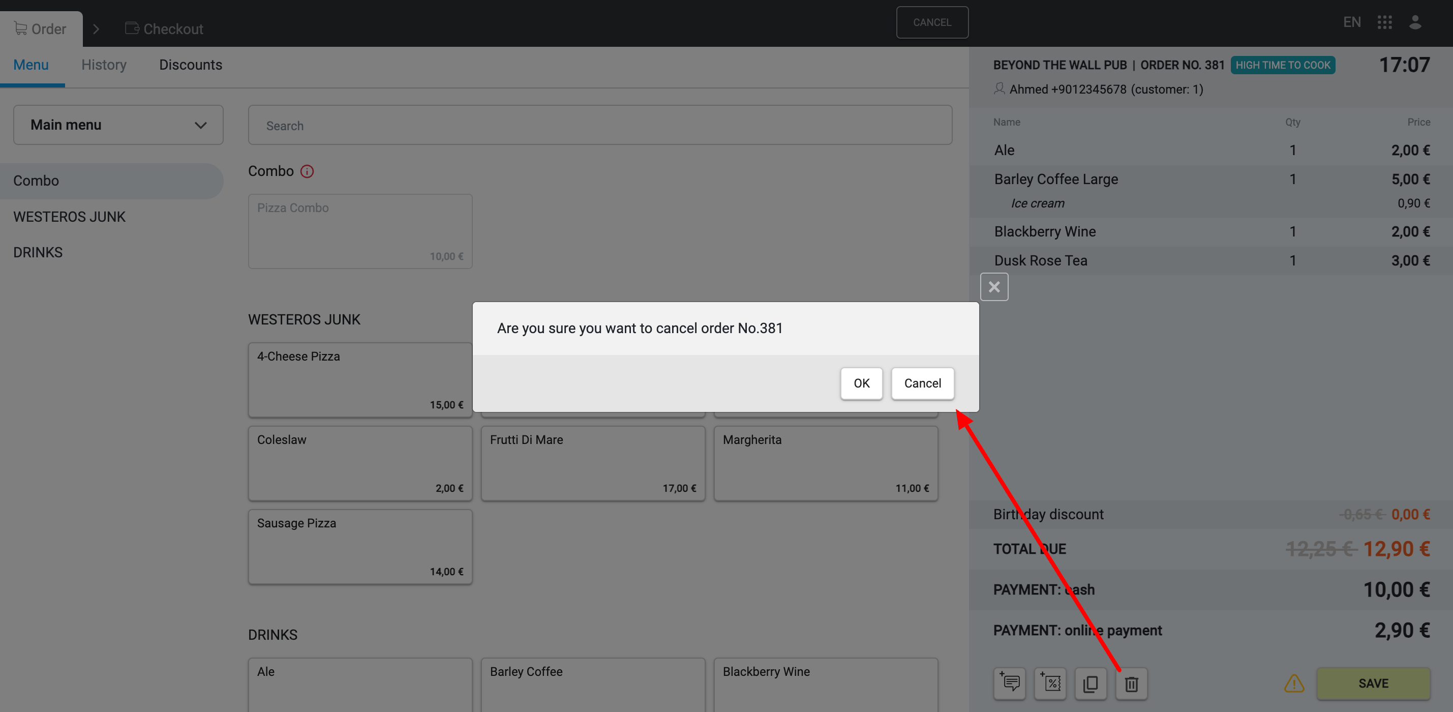 Aby zmienić modyfikatory pozycji, usuń całą pozycję i dodaj ją ponownie z potrzebnymi modyfikatorami. Podobnie możesz zmienić składniki zestawu — usuń zestaw z zamówienia i dodaj go ponownie z innymi składnikami.
