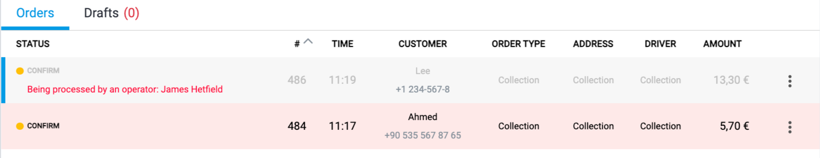 Tylko jeden operator może edytować zamówienie w danym czasie, dla pozostałych pracowników zamówienie to jest niedostępne — na liście zamówień jest podświetlone na szaro i pokazuje nazwę operatora, który je obsługuje.