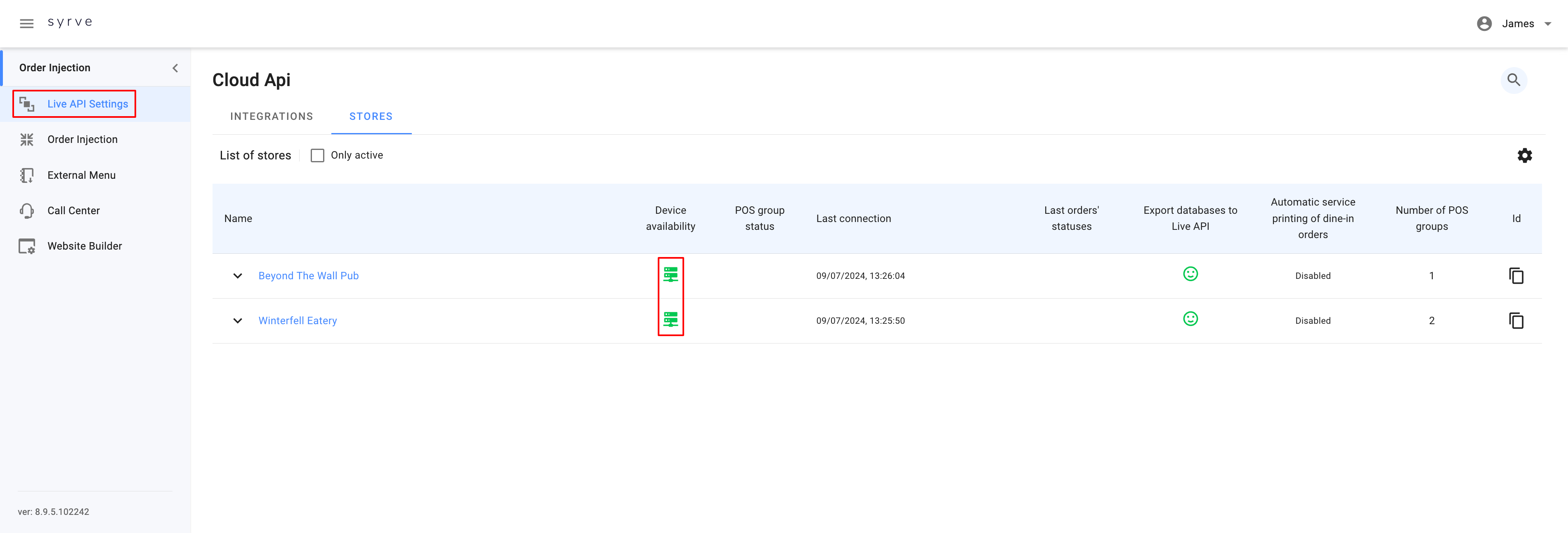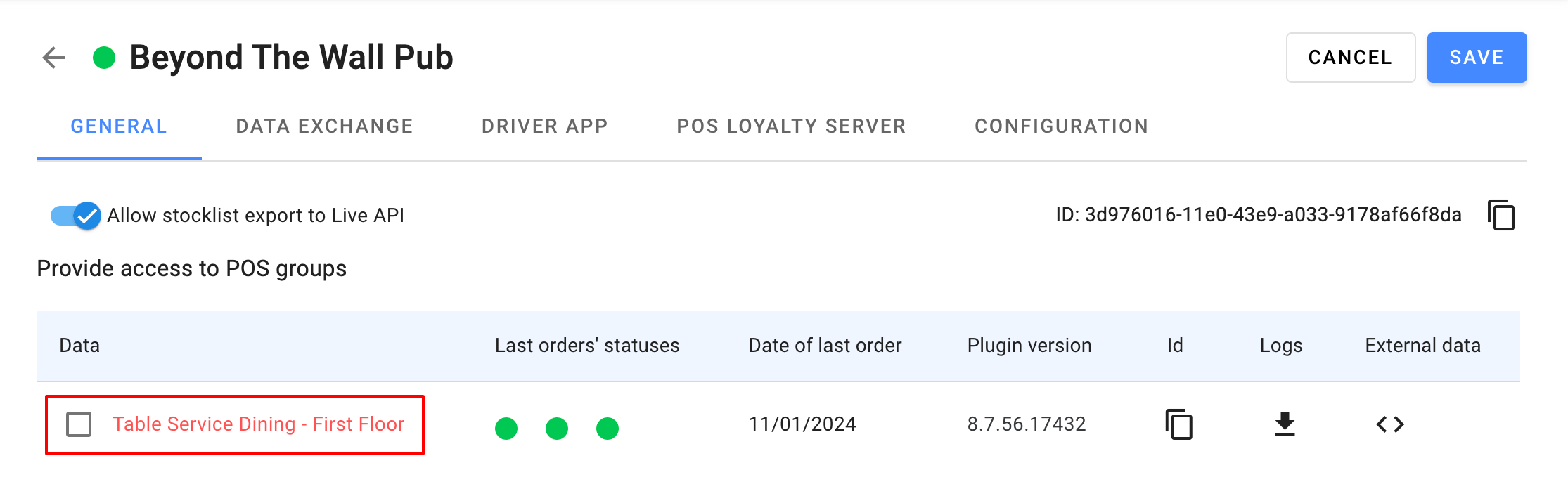 Upewnij się, że grupa POS jest włączona w Ustawieniach Live API dla domyślnego sklepu oraz że wskaźnik wybranego sklepu jest zielony.