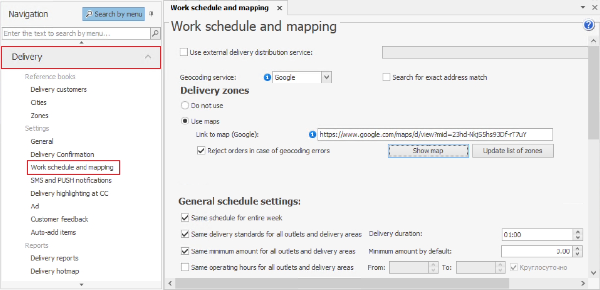 Aby włączyć dostawę i określić grupę terminali, w której będą przyjmowane i przetwarzane zamówienia, a także określić koszt dostawy, strefy dostawy i godziny pracy, skonfiguruj harmonogram pracy oraz ustawienia mapowania. Aby to zrobić, będąc w aplikacji Syrve, przejdź do Ustawienia systemu i konserwacja > Dostawa > Godziny pracy i mapowanie. Więcej informacji znajdziesz w artykule Godziny pracy i mapowanie.