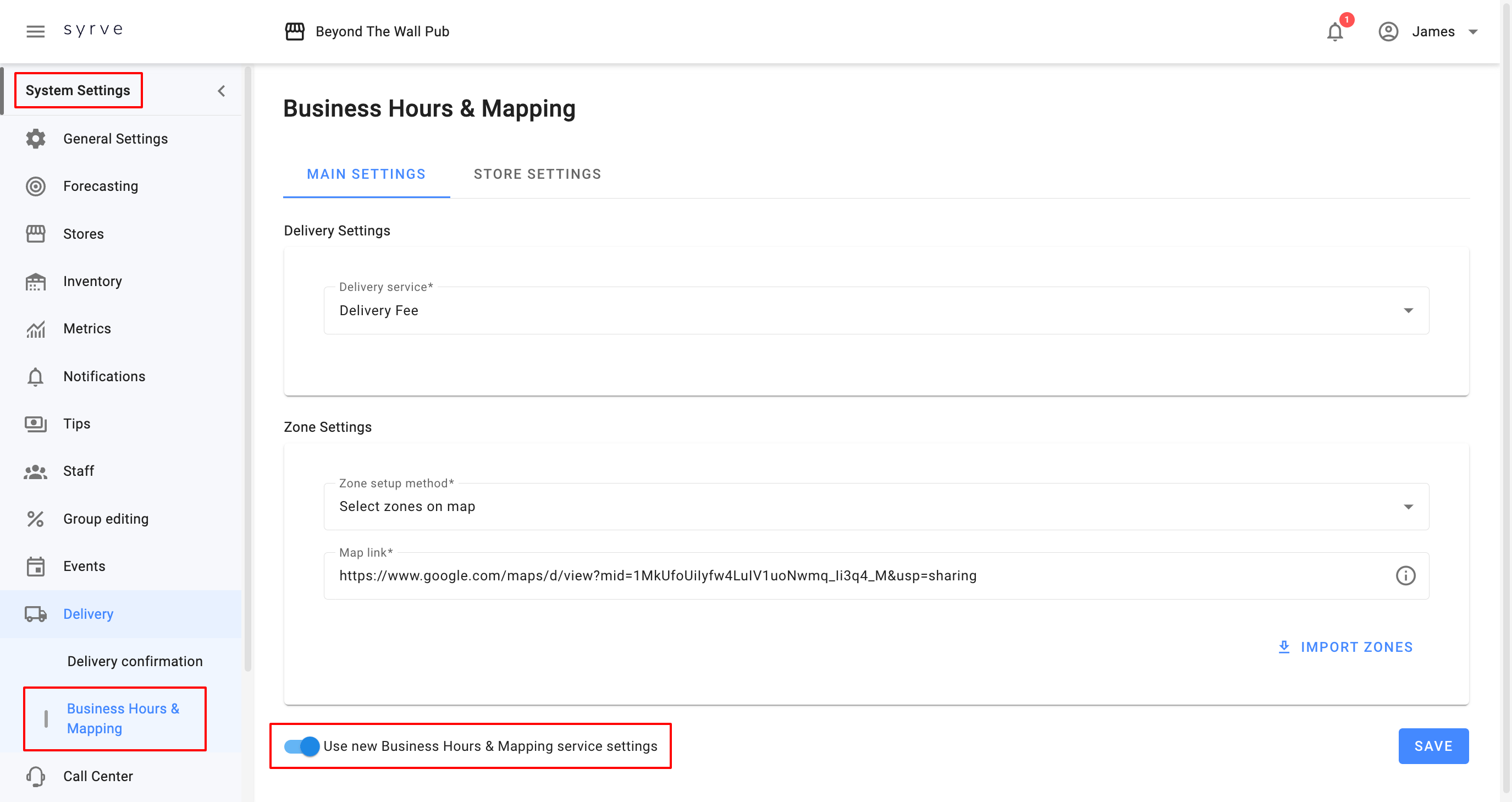 Aby korzystać z ustawień godzin pracy i mapowania wykonanych w aplikacji Syrve w call center, zaznacz opcję Używaj nowych ustawień usługi Godziny pracy i mapowanie.